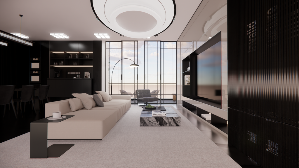 A modern open-concept living area combining clean lines, premium materials, and functional layout planning.