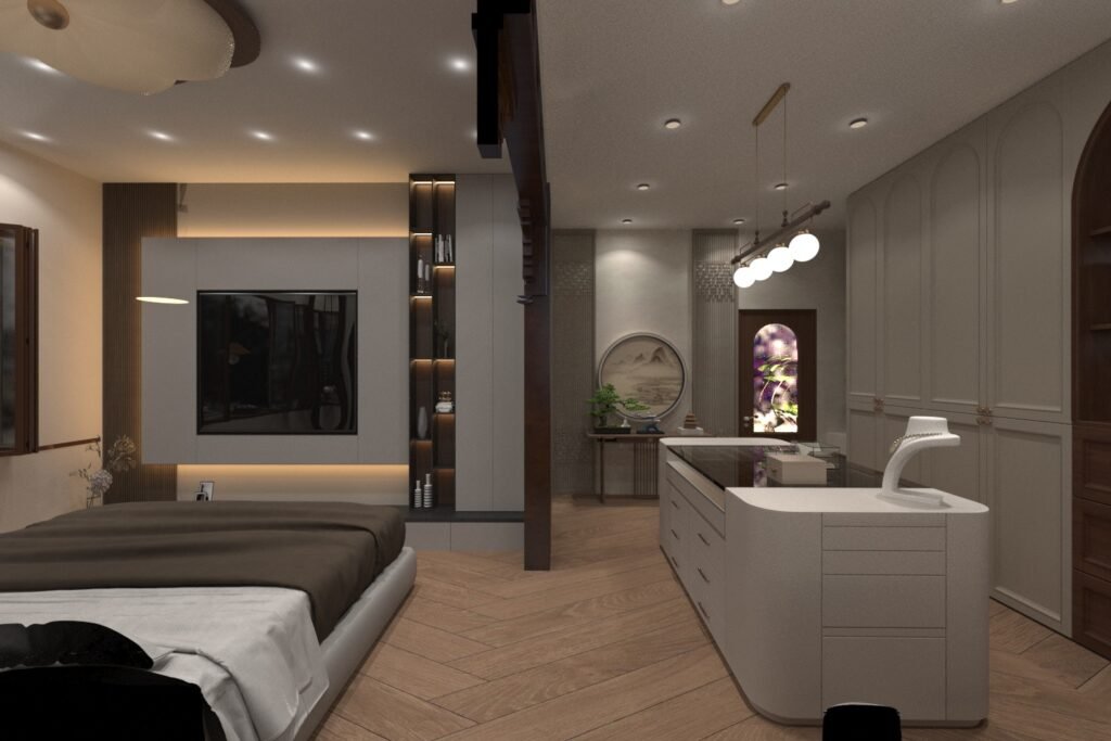 A refined bedroom design featuring warm lighting, custom carpentry, and elegant finishes for a comfortable, luxurious living experience.